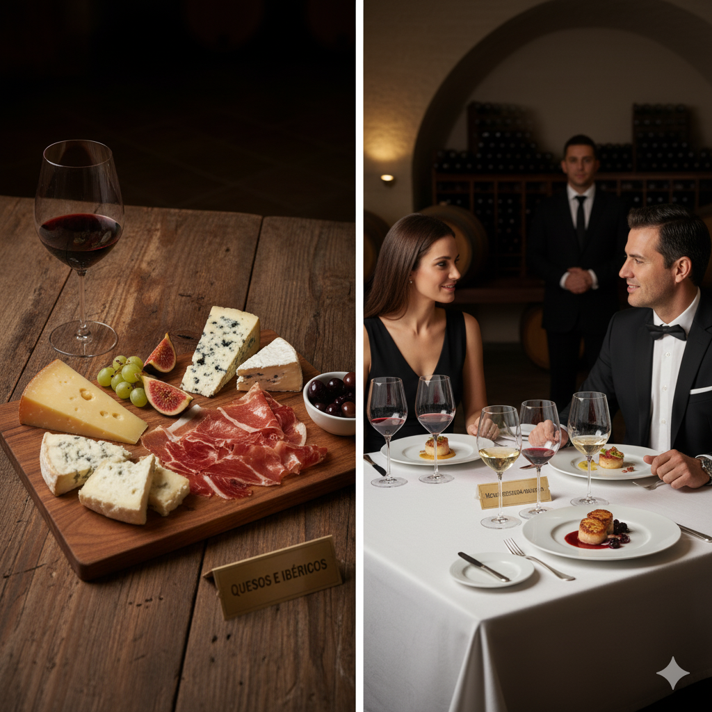La armonía es esencial. Diseñamos el acompañamiento gastronómico al nivel que usted desee: desde una cuidada selección de quesos artesanos e ibéricos de bellota hasta un menú degustación diseñado para maridar con cada copa